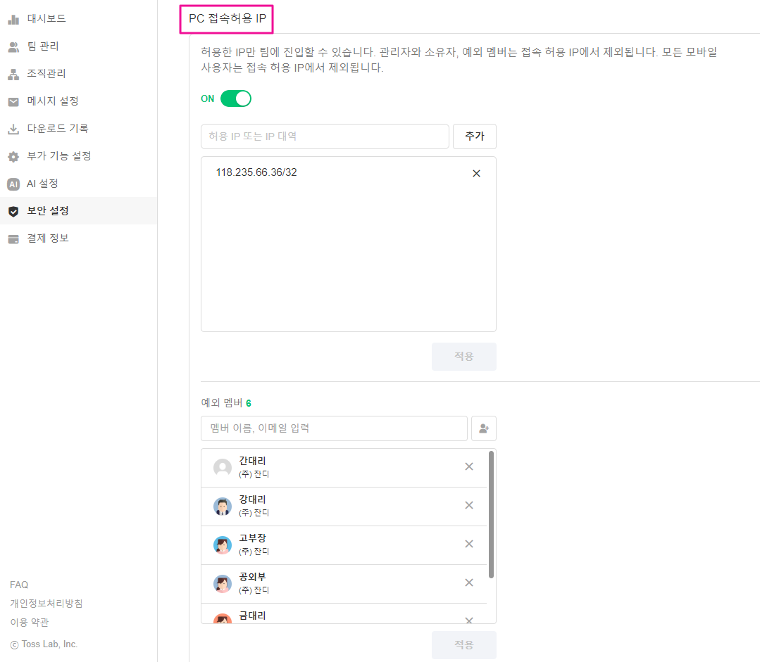 팀의 보안을 위해, 허용한 IP만 팀에 접속할 수 있도록 설정할 수 있습니다.
