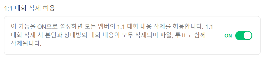 1:1 채팅을 전체 삭제하는 기능을 팀 관리자가 설정할 수 있습니다.