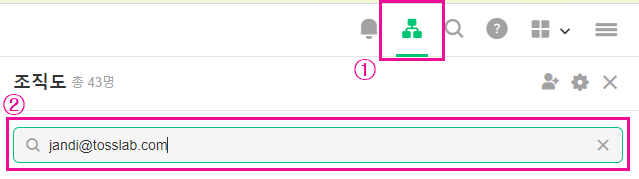 PC 기준 : 우측 상단 [조직도] - [검색 입력창]에 이메일 입력