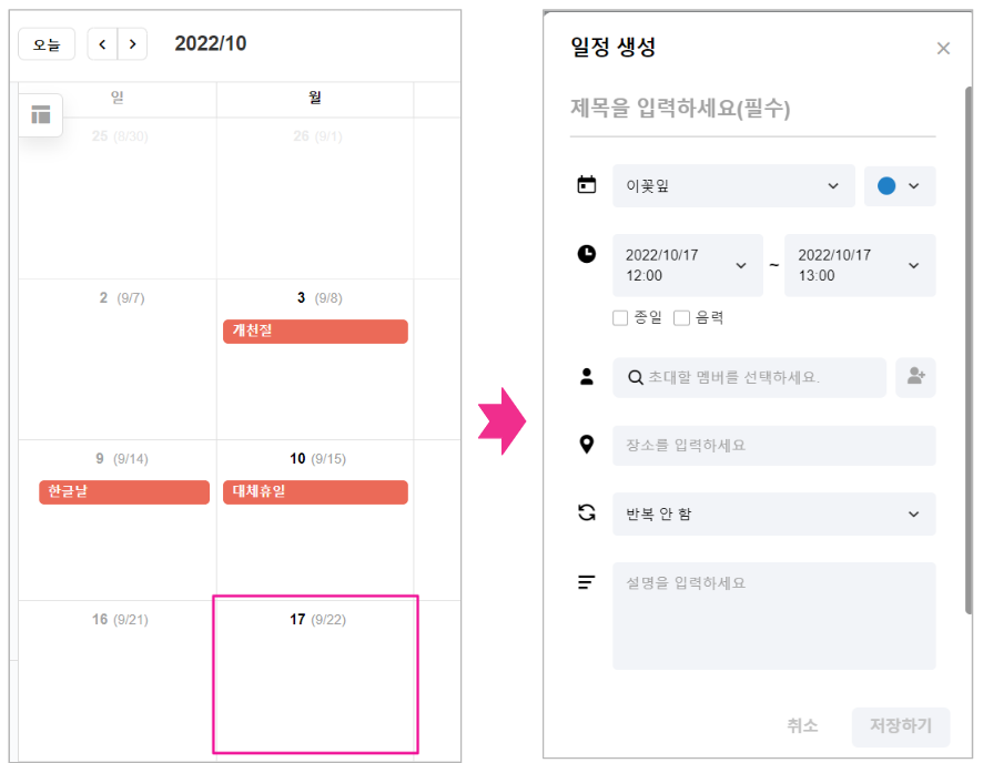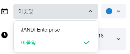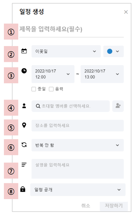 - 색상 선택 : 일정에 표시될 색상을 선택합니다. 개인 캘린더 색상이 기본 색상입니다. ex. 개인 캘린더 색상이 파란색 / 일정 생성을 빨간색으로 설정한 경우에는 본인에게만 반영됩니다.