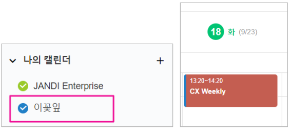 - 일정 유무 공개 : 일정에 초대되지 않은 멤버와 일정에 초대 안된 관리자에게는 비공개 일정으로 표시됩니다. 일정에 초대된 멤버와 캘린더 관리자는 상세 내용을 확인할 수 있습니다.