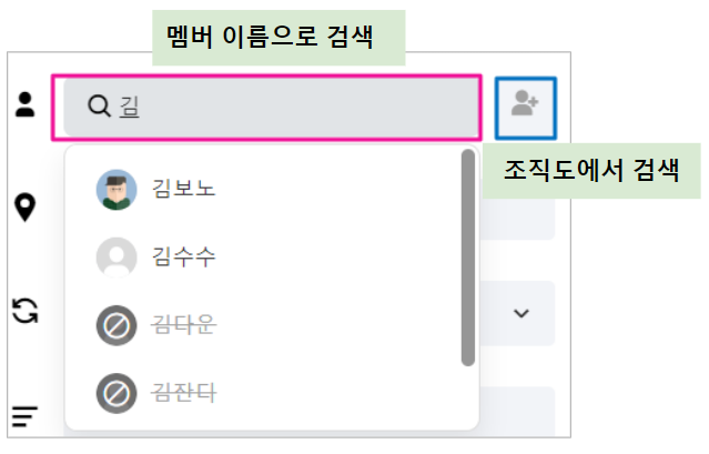 - 멤버 이름으로 검색을 하거나 조직도에서 멤버를 검색하여서 참석자를 추가할 수 있습니다.