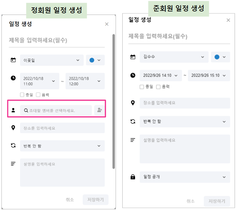 - 준회원은 일정 생성 시 참석자 초대를 할 수 없습니다.