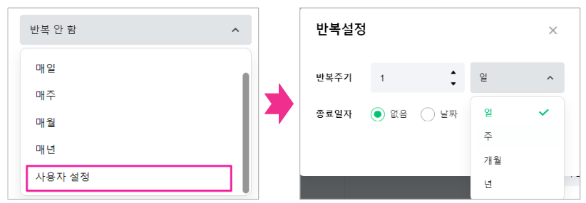 사용자 설정 클릭 시 반복 주기, 종료 일자 등을 설정할 수 있습니다.