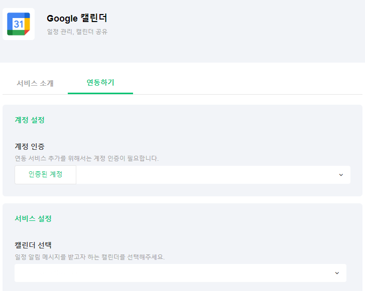 'Google 캘린더 계정 인증하기' 를 선택하고, 연동할 구글 계정으로 로그인 합니다. 인증 창에서 '허용'을 선택합니다.