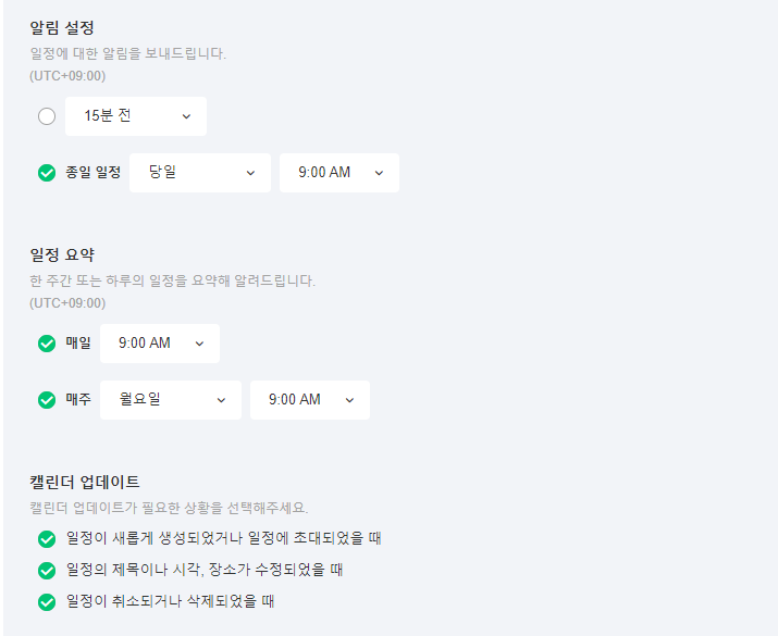 연동할 캘린더와 알림을 받을 토픽 혹은 채팅을 선택합니다.