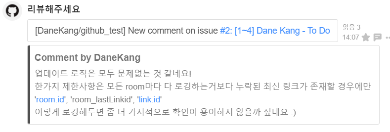 * 잔디 커넥트로 GitHub을 연동하여, 효과적으로 코드 변경사항을 파악할 수 있습니다.