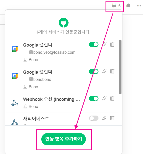 1. 토픽 상단 또는 메뉴바에서 플러그 모양의 [잔디 커넥트] 버튼을 클릭 후 [연동 항목 추가하기]를 선택합니다.