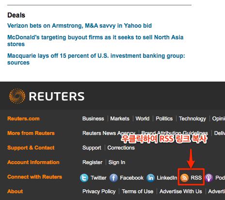 RSS는 보통 아래 이미지와 같은 아이콘 인데요, 이 RSS 아이콘을 우클릭 하여 링크를 복사하시면 됩니다.