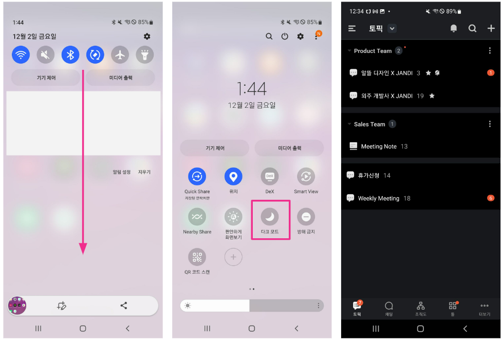빠른 메뉴 화면에서 [다크 모드] 활성화 즉시 적용됩니다.