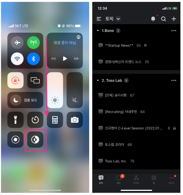 제어 센터에서 [다크 모드] 활성화 시 즉시 적용됩니다.