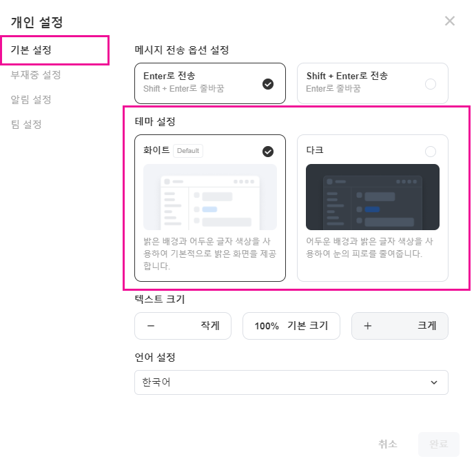 화이트 / 다크 테마 중에서 선택이 가능하며 화이트 테마를 기본으로 제공하고 있습니다.