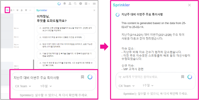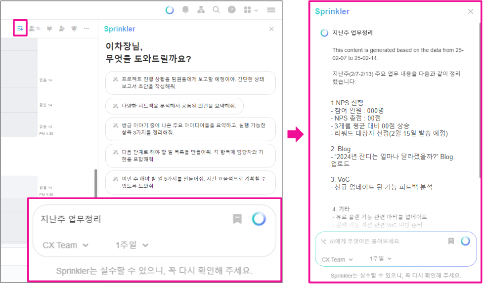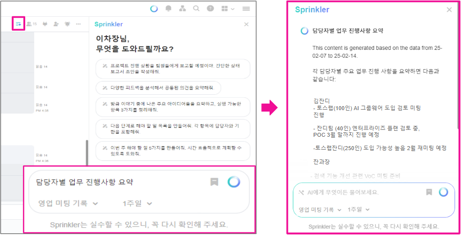 진행중인 업무 요약, 스프링클러에게 물어보세요!
