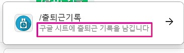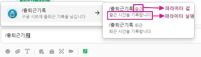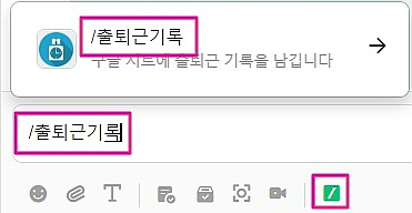 '시작 키워드' 예시) '출퇴근기록'을 시작 키워드로 입력했을 경우 실제 메시지 입력창에서는 아래와 같이 보여집니다. 채팅창에 직접 '/'를 입력하거나 [/] 버튼을 클릭 후 원하는 키워드를 선택하시면 됩니다. 커맨드 목록에서 키워드를 선택하지 않을 경우 웹훅을 설정한 커맨드로 인식되지 않으니 사용 시 주의해 주세요!