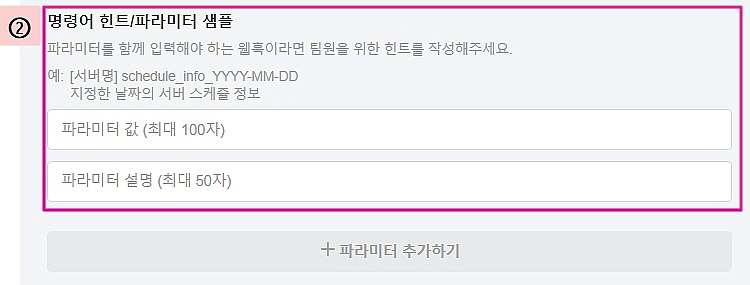 ② 명령어 힌트 / 파라미터 샘플 : 파라미터는 100자까지 입력이 가능하고, 파라미터 설명은 50자까지 입력할 수 있습니다. 파라미터 값과 파라미터 설명을 입력할 경우 다른 사람이 설정한 아웃고잉 웹훅을 쉽게 조회하고 사용할 수 있게 됩니다. 1개의 웹훅 당 최대 10개까지 파라미터를 입력할 수 있습니다.