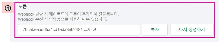 ④ 토큰 : Webhook 발송 시 페이로드에 삽입되는 토큰을 확인할 수 있습니다.