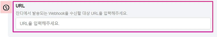 ⑤ URL : 잔디에서 발송되는 팀용 Webhook을 수신할 URL을 입력해 주시면 됩니다.