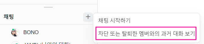 1. 잔디 창 좌측 하단 채팅 리스트에서 (+) - [차단 또는 탈퇴한 멤버와의 과거 대화 보기]를 클릭해주세요.