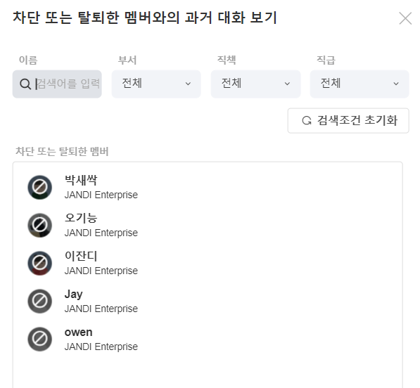 차단 혹은 탈퇴한 팀 멤버의 경우에도 이전 대화 히스토리(1:1 대화)를 확인할 수 있습니다.