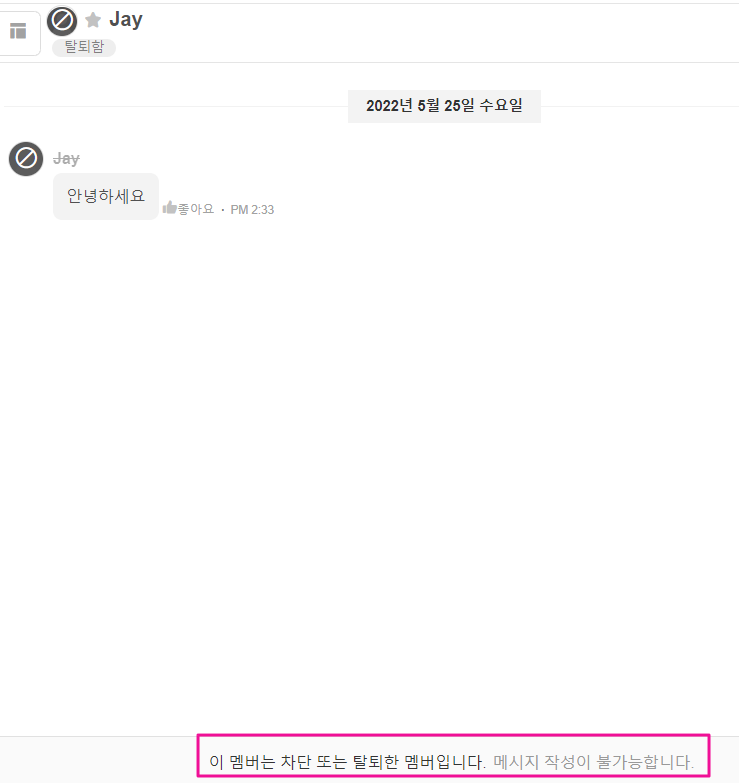 3. 차단 또는 탈퇴한 멤버와의 대화창에서는 메시지 작성은 불가능하며, 이전에 주고받은 메시지만 확인이 가능합니다. 멤버 이름 아래에서 '차단' 혹은 '탈퇴'로 멤버의 상태를 확인할 수 있습니다.