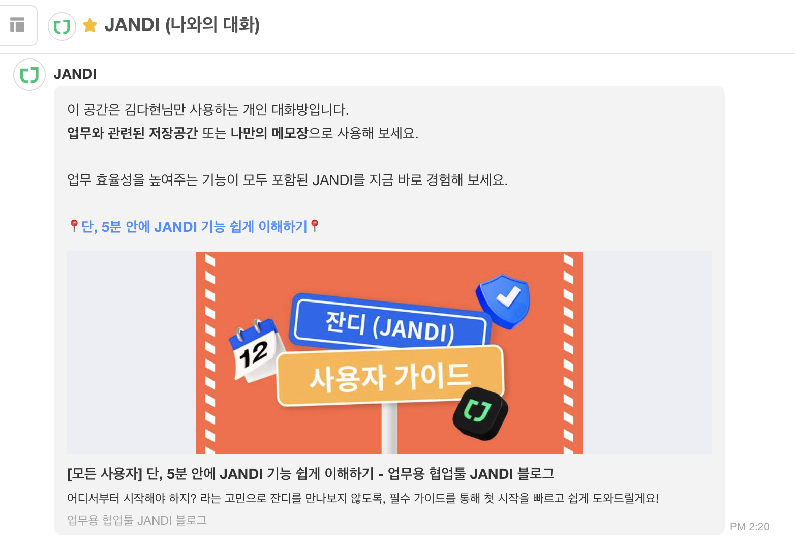 ✔️ 채팅 JANDI는 개인별 대화방이므로 잔디 사용법 및 잔디 팀에게 물어보고 싶은 궁금한 점은 [1:1 문의하기]를 이용해주세요.