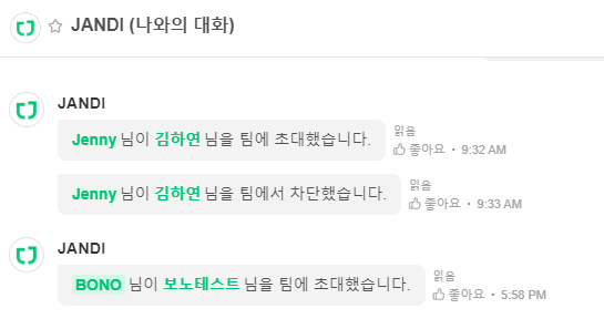 3. 채팅 JANDI는 팀 관리자의 경우에 팀에 멤버가 초대 및 차단되면 해당 사항을 메시지로도 알려주고 있습니다.
