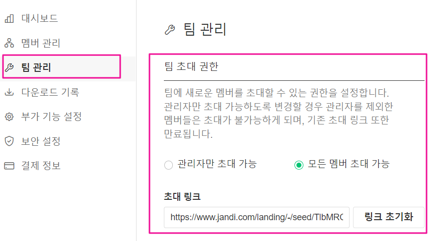(초대 링크 만료 문제) 팀 초대 권한 제한을 풀고 싶습니다.