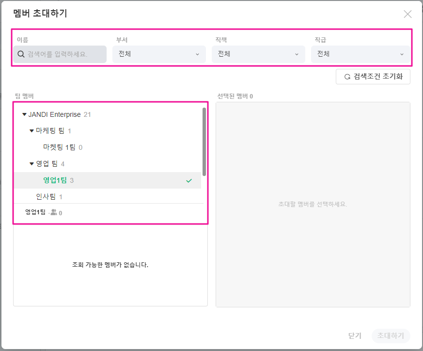 2. 초대할 멤버를 선택합니다. 팀 멤버 리스트에서 선택하거나, 이름을 직접 검색한 후 [초대하기] 버튼을 눌러주세요.