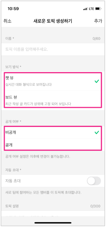 ✔️ 보기 방식과 공개 여부 설정은 한 번 토픽을 만들면, 나중에 변경이 불가능합니다.