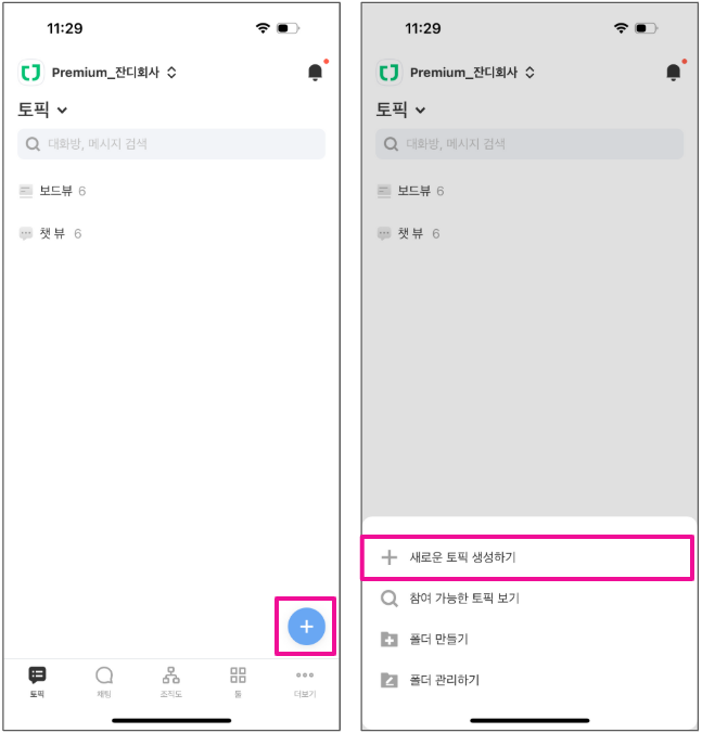 * 토픽은 모든 정회원 멤버가 자유롭게 만들 수 있습니다. 업무 상황에 맞춰 다양한 토픽을 만들어 보세요.