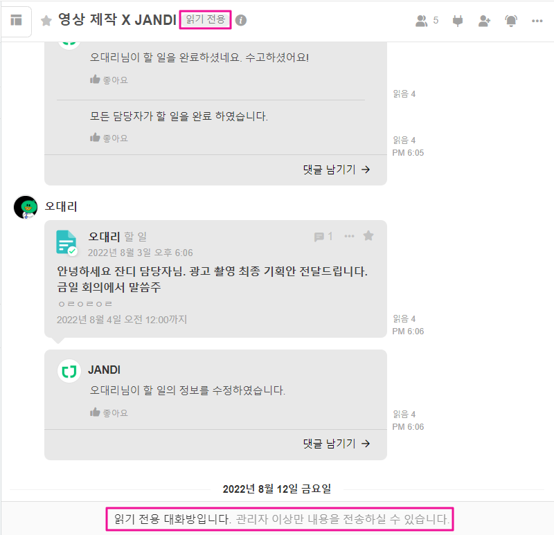 그럴 때는 잔디의 '읽기 전용' 토픽 설정을 통해 팀 멤버들에게 공지사항을 효율적으로 전달해보세요!