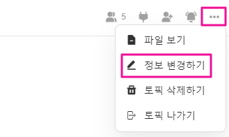 1. 토픽 우측 상단 [···] - [정보 변경하기] 버튼을 클릭합니다. 토픽 관리자만 정보 변경이 가능합니다.