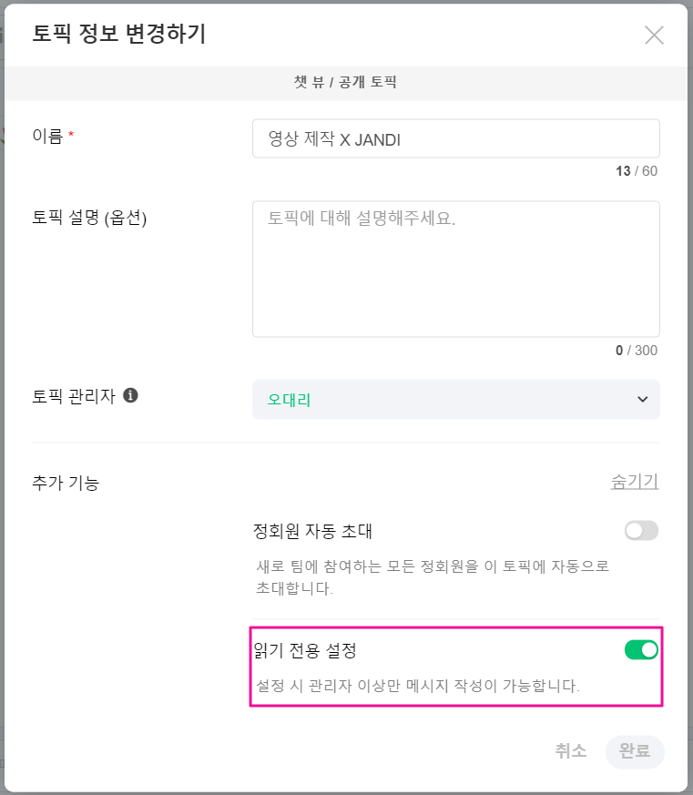 2. '토픽 정보 변경하기' 창에서 [읽기 전용 설정] 여부를 선택해주세요.