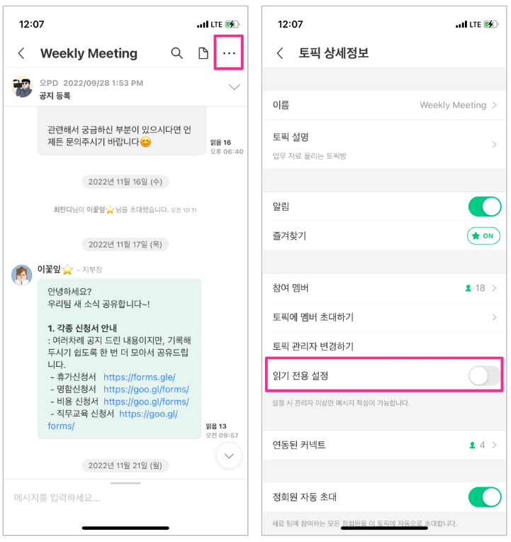 1. 토픽 대화창 우측 상단 [···] 메뉴 버튼을 터치해 표시되는 화면에서 [읽기 전용 설정] 메뉴를 선택합니다.