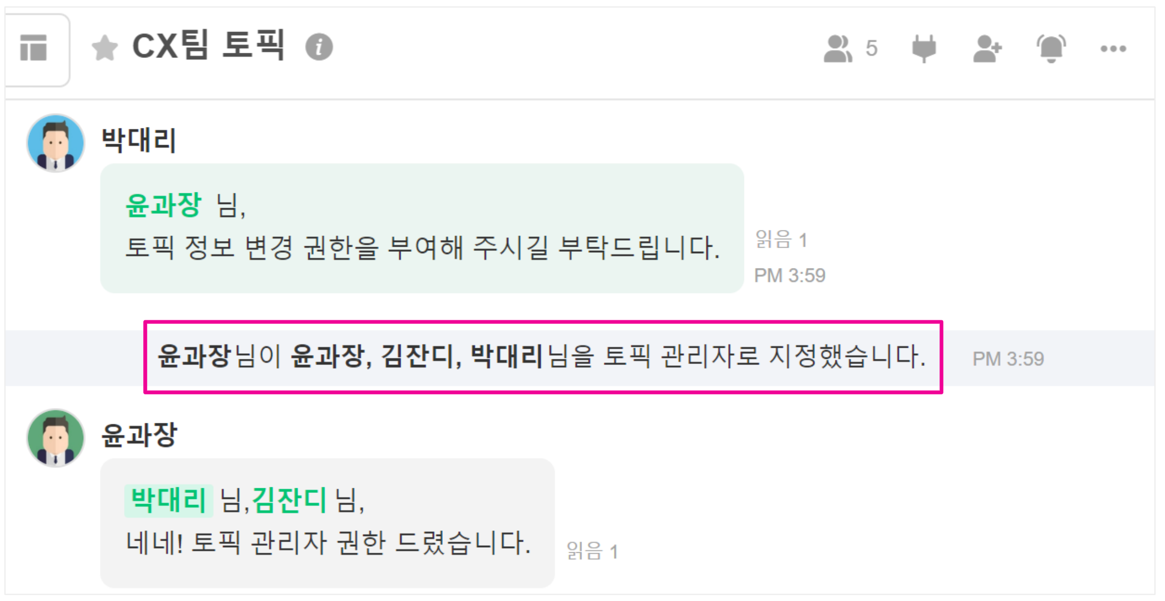 또한, 토픽 관리자가 변경되면 어떤 멤버가 변경했는지 확인할 수 있습니다.