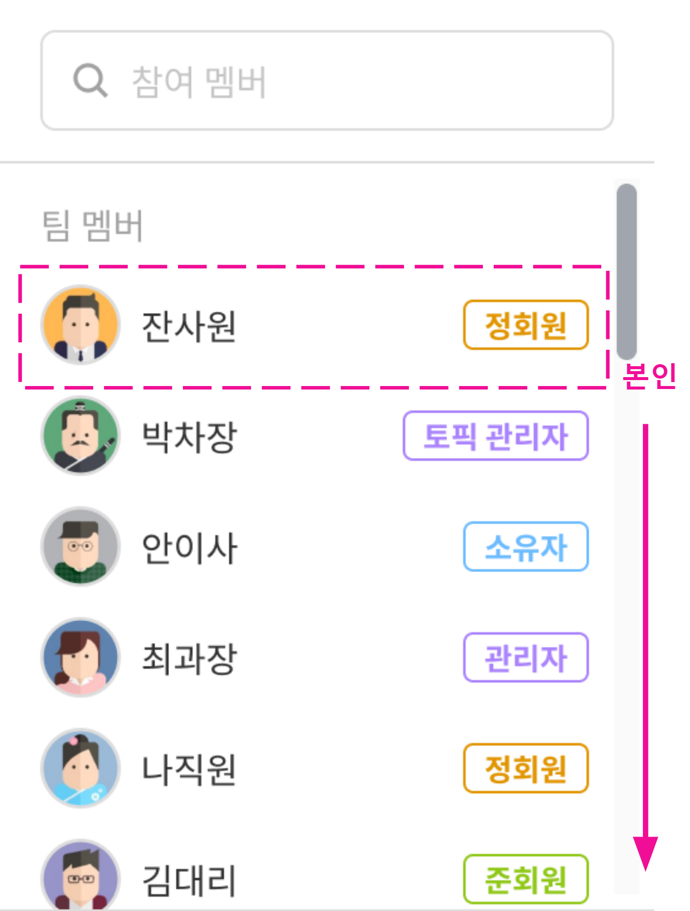 본인 > 토픽 관리자 > 소유자 > 관리자 > 정회원 > 준회원 순으로 노출되며, 동일한 권한의 경우 이름순으로 노출 되도록 개선되었습니다.