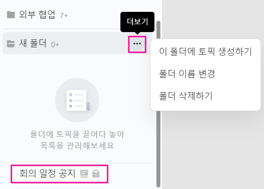 3. 토픽 탭에서 (+) 버튼 - [폴더 관리하기] 버튼 클릭 시, 폴더순서 변경 / 폴더 이름 변경 / 폴더 삭제 모두 가능합니다.