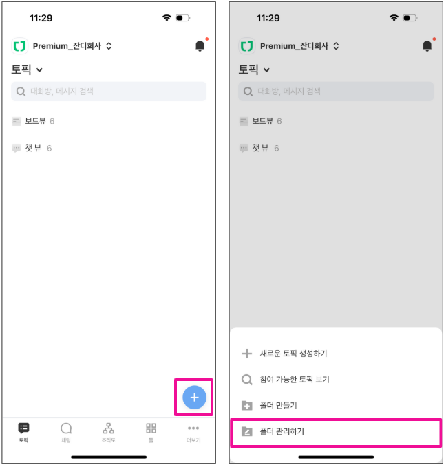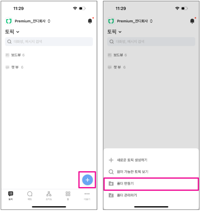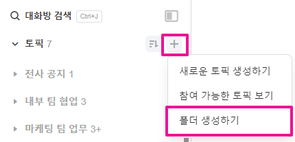1. 토픽 탭에서 (+) 버튼을 눌러 [폴더 만들기] 메뉴를 선택해주세요.