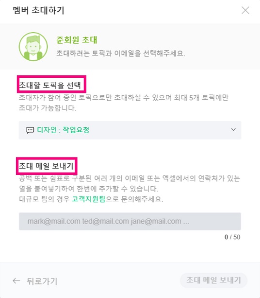cf) 100명 이상의 멤버초대가 필요하신 경우에는 잔디팀에 support@tosslab.com으로 연락 주세요.