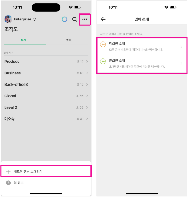 1. [조직도] 탭에서 화면 우측 상단 [...]더보기 > [새로운 멤버 초대하기]을 터치해 표시되는 멤버 초대 창에서 정회원/준회원 권한을 선택해 멤버를 초대해주세요.