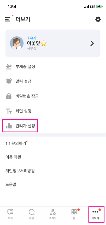모바일 화면 하단 더보기[...] - 관리자 메뉴 터치하기