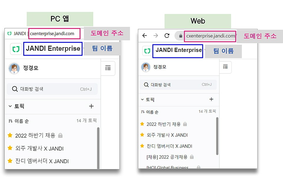 • Web의 경우, 인터넷 주소 표시줄을 확인합니다. PC 앱의 경우에도 앱 상단에 팀도메인 주소가 표시됩니다.