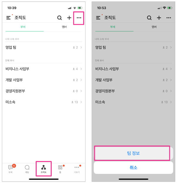 • [조직도] 탭 상단, [···] 버튼을 터치하면 표시되는 [팀 정보] 화면에서 URL 주소를 확인합니다.