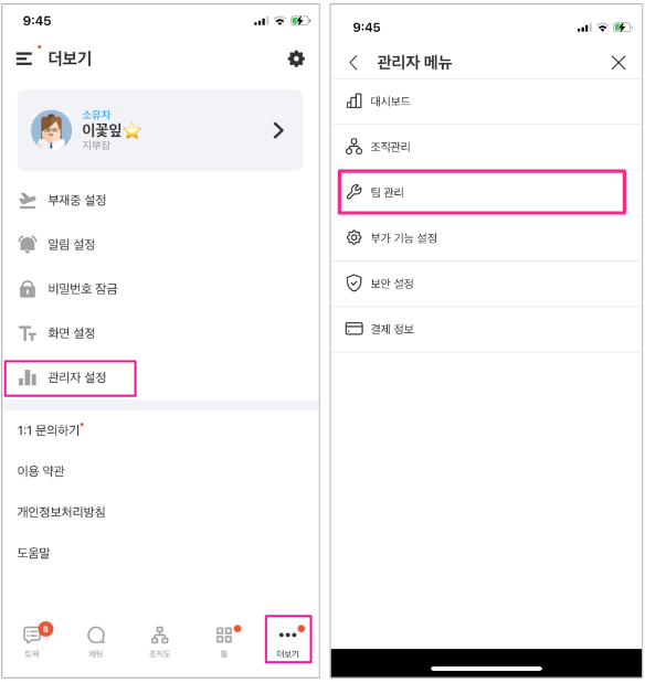• 모바일 앱 하단 더보기[...] > 관리자 메뉴 > 팀 관리에서 팀 이름 및 주소를 확인 후에 원하는 작업을 진행할 수 있습니다.
