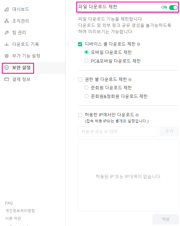 * 다운로드 제한 설정과 관계 없이, 파일 미리보기는 설정 값에 적용됩니다.