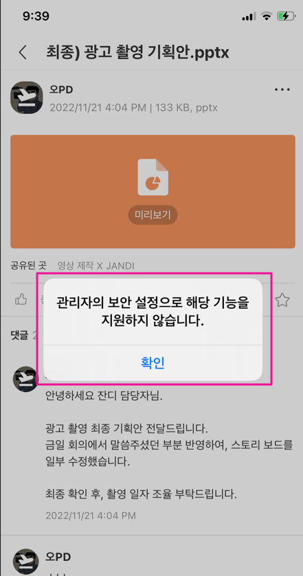 [모바일 다운로드 제한]을 설정한 경우, 모바일에서 파일 다운로드 시도 시 아래와 같은 알럿이 노출됩니다.