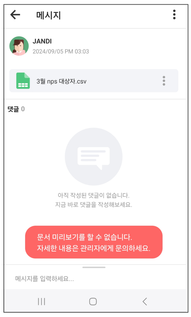 [문서 미리보기 제한]을 설정한 경우, 문서 클릭 시 아래와 같은 알럿이 노출됩니다.