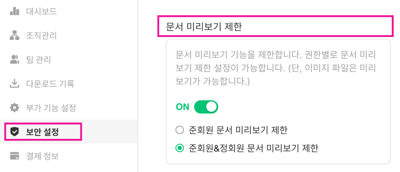 멤버 권한별로 문서 미리보기 제한 여부를 설정할 수 있습니다.