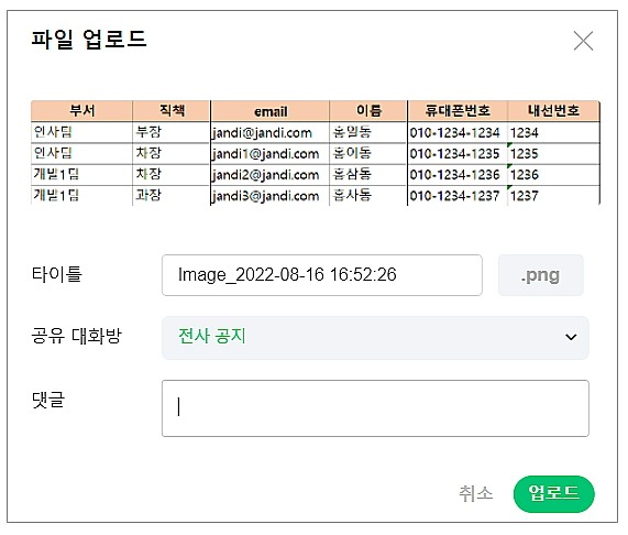 2. 메시지 입력창에 복사한 표의 내용을 붙여넣기 하면 (Ctrl + V) 바로 파일 업로드 창이 표시됩니다.