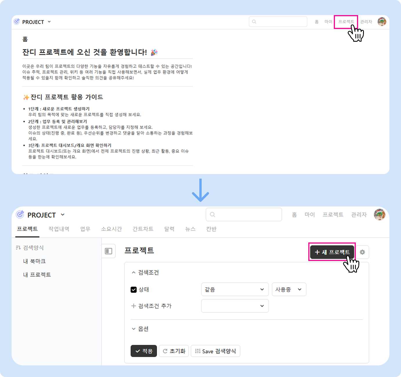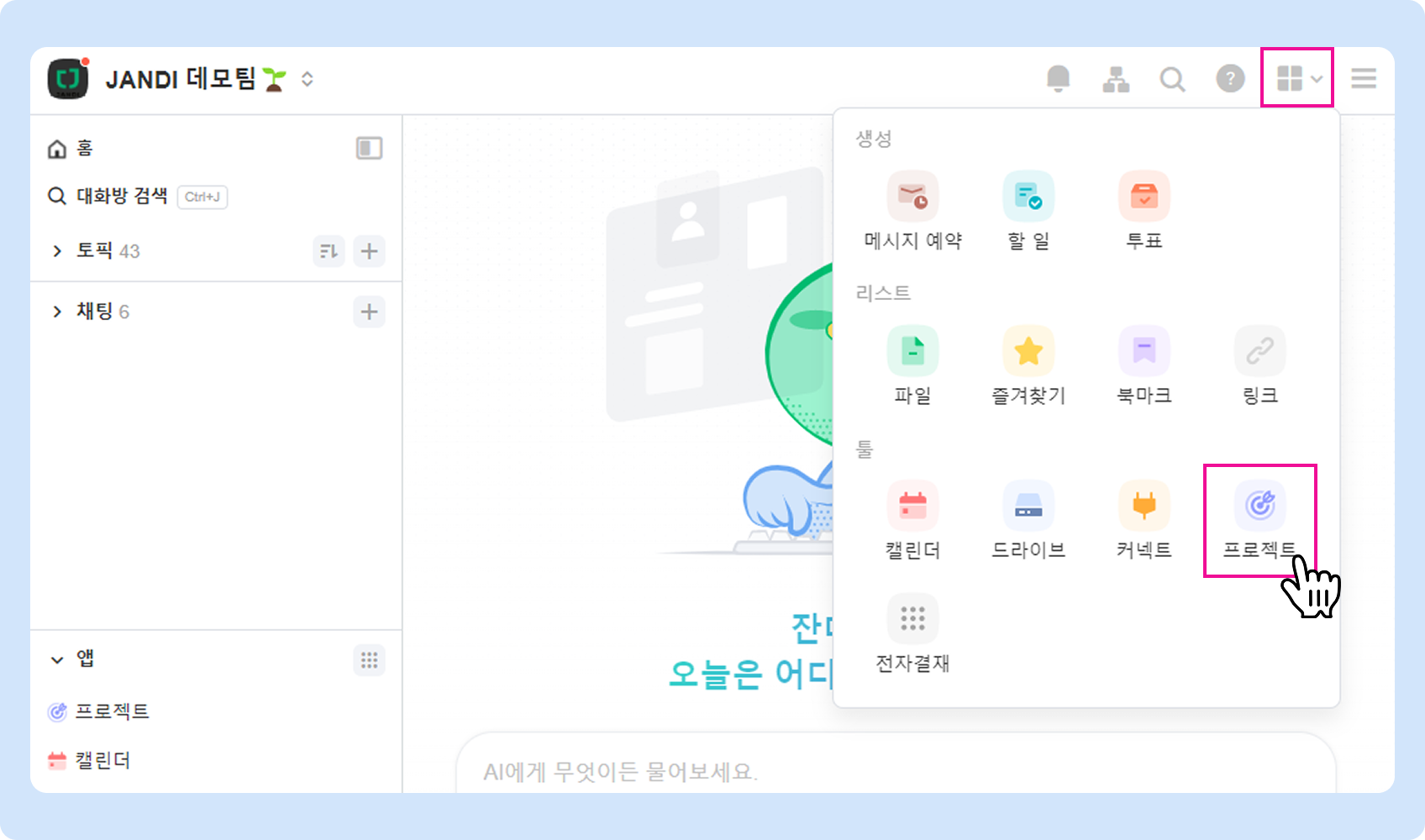 잔디 우측 상단 [메뉴] > [프로젝트]를 클릭해 프로젝트로 이동해 주세요.